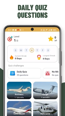 Kickstart each day with a fresh set of quiz challenges! Attempt the Daily Quiz and earn XP to keep your learning streak alive. Whether you’re an aviation enthusiast or just starting, you’ll enjoy identifying different planes.