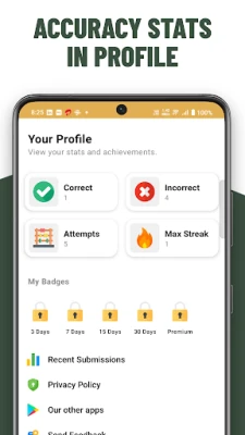 Track your correct and incorrect answers, total attempts, and max quiz streaks. Collect badges for your achievements. View all your submissions and progress in one place.