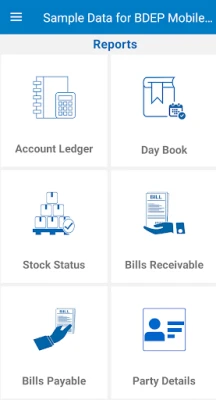 b) DayBook, Account Ledger, Bills Receivable/Payable, Stock Status & Party Details can be viewed.