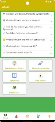 The Gilbert Syndrome application was created for those people who already suspect that they have this disease and for those who want to understand how to live with this disease.