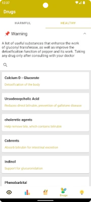 This section includes a list of products - inducers and inhibitors of the enzyme glucuronyl transferase, which is responsible for the processing of bilirubin in the liver.